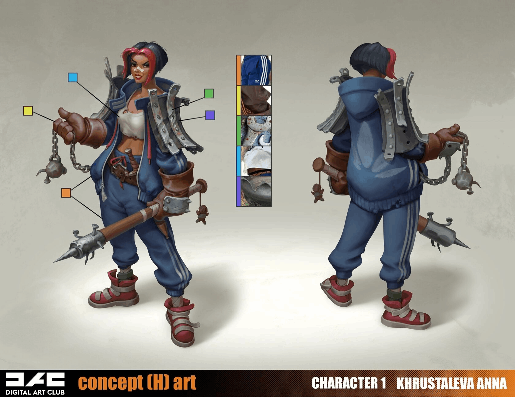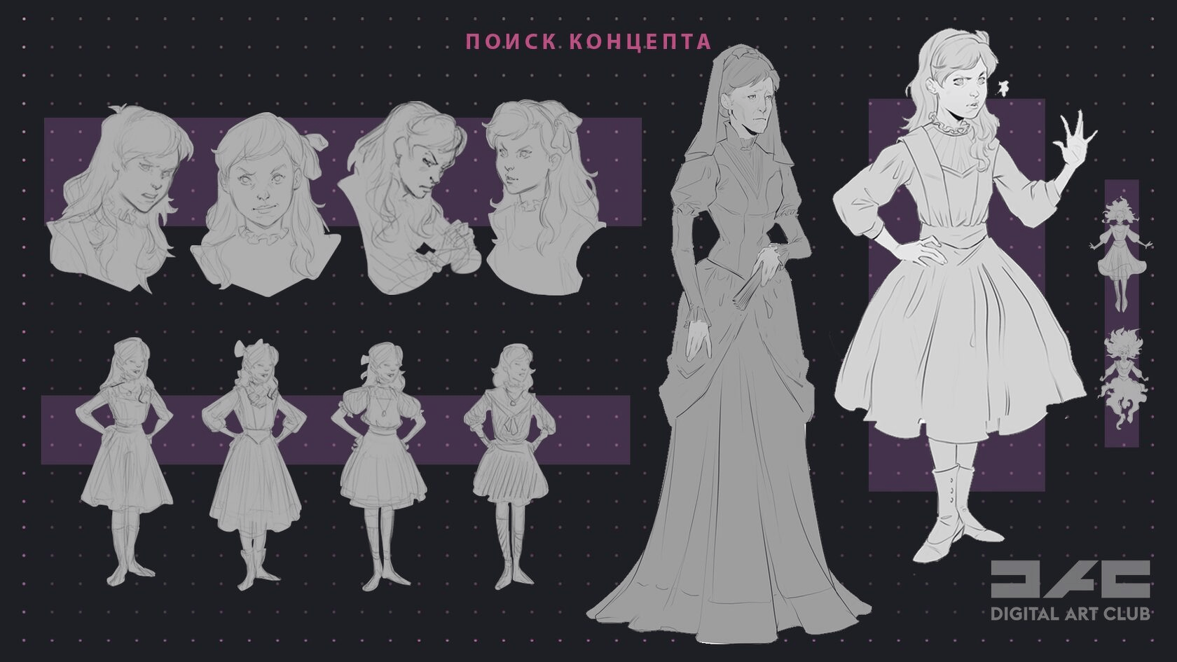 — Фокуспойнты в концепте — Силуэты — Детали 3,2,1 порядка — Цвет и цветовые акценты — Материалы и рендер — Финализация — Оформление — ФИНАЛ 1: создание персонажей в стиле Fortnite, Overwatch, Slash — ФИНАЛ 2: создание персонажа в стиле семиреализм — ФИНАЛ 3: дипломная работа