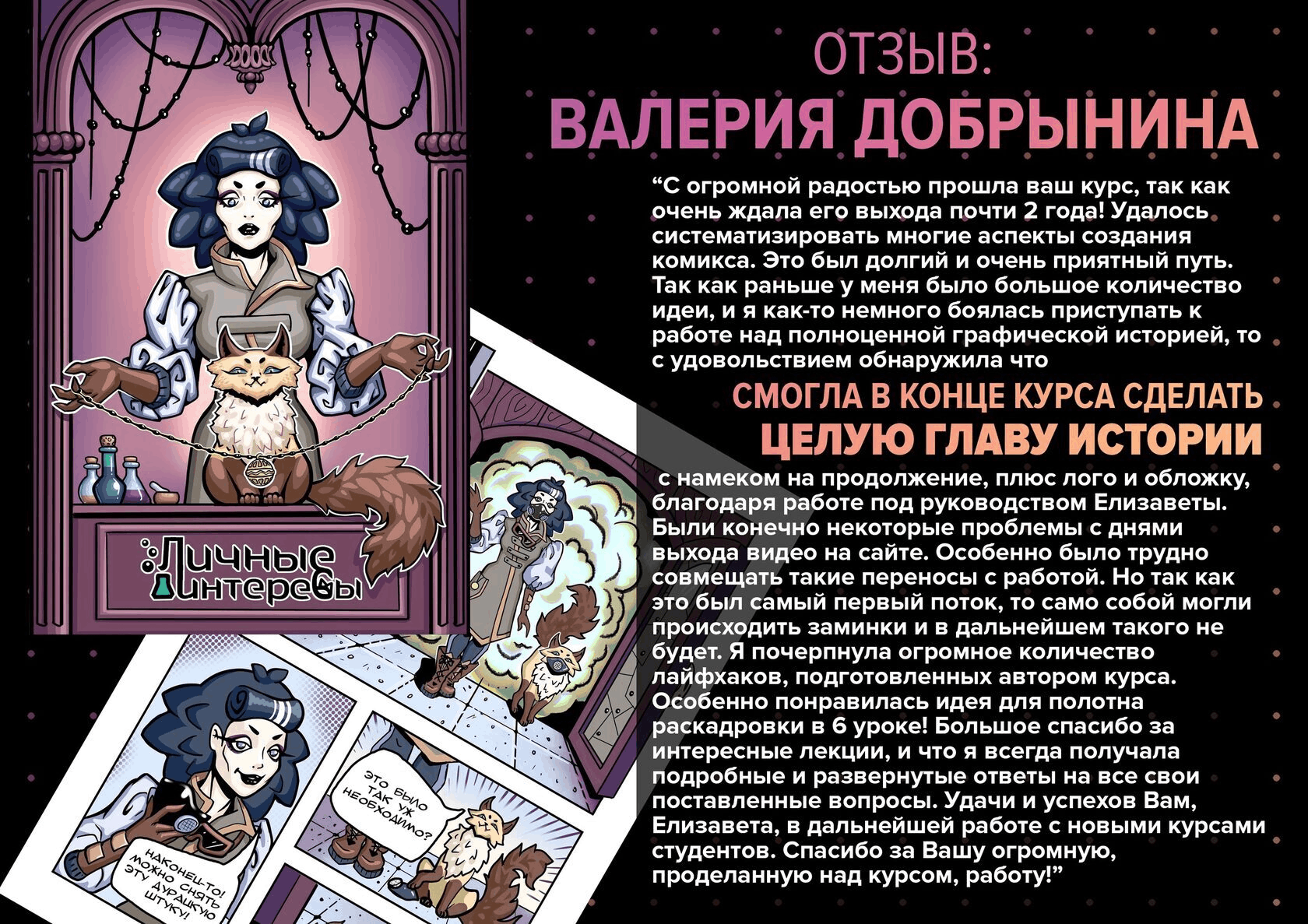 Елизавета не просто преподаватель, она — капитан у штурвала корабля под названием «КОМИКСОЛОГИЯ» в нашей школе! Особенность курса — в комплексном подходе к обучению, что позволяет обучить целому отдельному виду искусства практически с нуля.